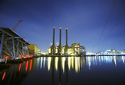 2. 발전 원리 화력발전소는 연료의 화학적 에너지를 전기에너지로 변환시키는 거대한 에너지 변환기구(Conversion Mechanism)로 물을 끓여서 나오는 증기로 발전기를 돌려 전기를 발생시킨다. 보일러는 물을 증기로 바꾸는 장치이며, 주전자 주둥이(노즐Nozzle)로 부터 분출하는 증기가 터빈을 회진시키고 터빈에 연결된 발전기(Generator)에서 전기를 발생시킨다. ① 발전 방식에 따른 원리 우선 중유나 석탄 등의 연료를 보일러에 넣은 다음, 적당량의 공기와 혼합하여 보일러 내에서 연소시킨다. 보일러 내에서는 관을 통하여 들어온 물이 가열되면 고압증기로 변해 터빈에 보내진다. 터빈은 수력발전소의 수차에 상당하는 것으로, 많은 회전 날개를 가지고 있다. 따라서 보일러에서는 고온, 고압의 증기를 이 회전날개에 불어넣어 터빈을 회전시키는 것이다. 터빈의 회전은 매우 빨라서 수력발전의 수차가 1분간에 125회전에서 750회전인데 비해 화력터빈은 3천회전에서 3천6백 회전을 한다. 터빈을 회전시킨 후의 증기는 복수기 속에서 냉각수에 의해 냉각되어, 재차 물로 돌아가게 된다. 그런 다음 급수펌프에 의해 급수로서 공급되어 과열기에서 가열, 다시 보일러로 보내진다. 이러한 화력발전은 크게 기력발전, 열병합발전, 복합발전으로 나눌 수 있다. ● 기력발전 기력발전은 보일러에서 연료를 태워서 얻은 열에너지로 물을 가열하여 증기를 만들고 그 증기로 증기터빈을 돌려 터빈에 연결된 발전기로 전력을 만드는 발전방식. 사용연료의 종류에 따라 중유발전소, 가스발전소, 석탄발전소 등으로 나누어지며 가장 많이 사용하는 화력발전 방식이다. • 운탄설비 선박으로 싣고 온 석탄을 하역하고 저탄조까지 석탄을 운반한 뒤 미분기에서 석탄을 잘게 부수어 보일러에서 잘 연소될 수 있도록 한다. - 원탄저장조 각 미분기마다 1개씩 설치되어 있다. - 석탄 흐름 감지 장치 석탄 배관에 설치된 장치로 석탄의 흐름을 방사성 동위원소를 이용하여 조기에 감지하여 중앙 제어실에 경보를 발생하도록 한다. - 원탄 급탄기 저장조에 저장된 석탄을 미분기에 공급한다. - 미분기 석탄을 연소에 적합한 크기로 분쇄하는 설비 - 미분탄 분리기 입자의 크기별로 분리하여 큰 것은 다시 미분기로 보낸다. - 미분탄 저장조 미분탄을 저장하는 설비로 4시간 정도 사용할 수 있는 분량을 저장한다. - 미분탄 급탄기 벤튜리 혼합기를 통하여 미분탄을 버너로 이동시킨다. • 보일러 1. 개요 발전용 보일러는 연료의 연소열을 이용하여 터빈이 필요로 하는 증기를 발생시키는 장치라고 정의할 수 있다. 이런 증기 발생장치에는 과열기, 재열기 및 절탄기를 포함하는 보일러 본체와 연료를 저장 공급하고 이를 연소시켜 열을 발생시키는 연료 연소설비, 연료의 연소에 소요되는 공기를 공급하고 연소 후 생성된 배기가스를 배출시키는 통풍설비, 보일러에 물을 공급하기 위한 급수설비, 보일러 부하 변동에 따른 연료공기 및 급수를 자동적으로 조정하는 자동제어 장치 및 기타의 부속설비로 구성된다. 2. 종류 발전용 보일러에는 드럼의 유무에 따라 드럼 보일러와 관류 보일러로 대별된다. 드럼 보일러는 보일러 내에서 보일러수의 순환이 자연력에 의해 행해지는 자여순환 보일러와 자연력만으로는 보일러수 순환이 불충분하여 강제로 보일러수를 순환시키는 강제순환 보일러로 나누어진다. 또 관류 보일러는 보일러수의 저장을 위한 드럼이 없으며 보일러수가 일정하게 배열된 관을 따라 흐르면서 가열된다. 이 보일러는 물이 전열 면을 1회 통과하는 벤슨 보일러와 전열면을 재순환하는 복합 순환보일러 및 슐러 보일러로 구분된다. - 초임계압 보일러(한전 표준석탄화력 발전소의 보일러 기준) 초임계압 관류보일러(Supercritical Pressure Boiler)는 초임계압 영역에서 발전하는 보일러이며 중간부하운전(일일 기동정지 및 주기운전)용 유연탄 화력으로 빈번하고 신속한 기동정지 및 높은 부하변동율, 안정된 저부하운전 및 기동손실의 최소화, 높은 열효율, 수명유지를 위한 열응력 감소 및 고도의 제어기술 적용등이 요구되는 곳에 적용된다. 초임계압이란, 물의 포화액선(Saturated Liquid Line)과 포화증기선(Saturated Vapor Line)이 만나는 점을 임계점이라 하며 이때의 압력, 임계압 이상의 압력을 말한다. 초임계압 영역에서 가한 열은 물을 증발시키는데 소요되는 증발잠열이 없으므로 항상 온도상승을 수반하고, 포화수와 포화증기의 비중량이 같아 아임계압의 드럼형 보일러에서 물의 밀도차에 의한 순환현상이 임계압력 이상에서는 없다. • 터빈 1. 터빈의 구조 ① 케이싱(Casing) 터빈 회전체를 덮고 있는 기밀실로서, 쉘(Shell) 및 실린더(Cylinder)라고도 한다. 증기가 일을 하기 위한 공간을 제공한다. ② 로터(Rotor) 케이싱 내부로 유입된 증기의 작용으로 증기의 열에너지를 기계적 에너지(회전력)로 변환시켜 발전기에 전달하는 부분이다. 로터는 축과 회전 날개로 구성되며 회전하는 부품 전체를 말한다. 회전날개는 터빈 부하 및 속도 제어와 밀접한 관계를 가지고 있으며 축은 회전날개와 더불어 가장 큰 응력이 발생하는 부분으로 충분한 강도를 가지