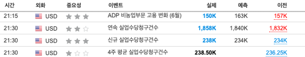 개장전에 발표된 급여처리회사 ADP의 6월 신규일자리 수치와 임금 증가율이 예상보다 적고, 지난주 실업수당청구건수는 1년만에 최고 건수로 예상보다 높아 노동시장 약세가 확연해지자 국채 금리는 내렸습니다.