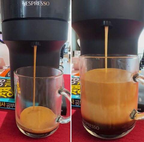 먼저 네스프레소 버츄오 머신의 캡슐커피 추출 시의 사진입니다.