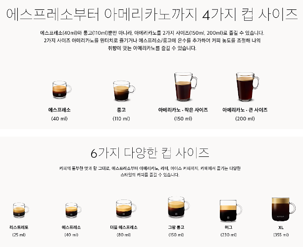 네스프레소 오리지널과 버츄오의 추출할 수 있는 커피 스타일은 다음과 같습니다.