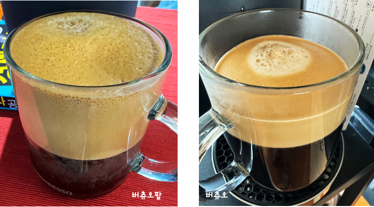 왼쪽 컵이 버츄오팝, 오른쪽 컵이 버츄오에서 추출된 커피입니다.