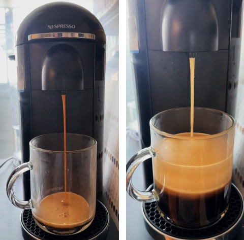 커피를 추출 중일 때와 추출 후에도 버츄오팝의 크레마 양이 월등하게 많다는 것을 보실 수 있습니다.