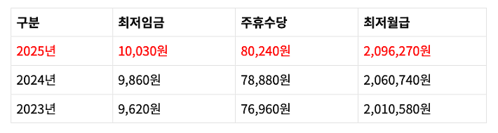 2024년과 비교해서 세전 최저월급은 3만5530원 증가, 최저연봉은 42만6360원 증가됩니다.