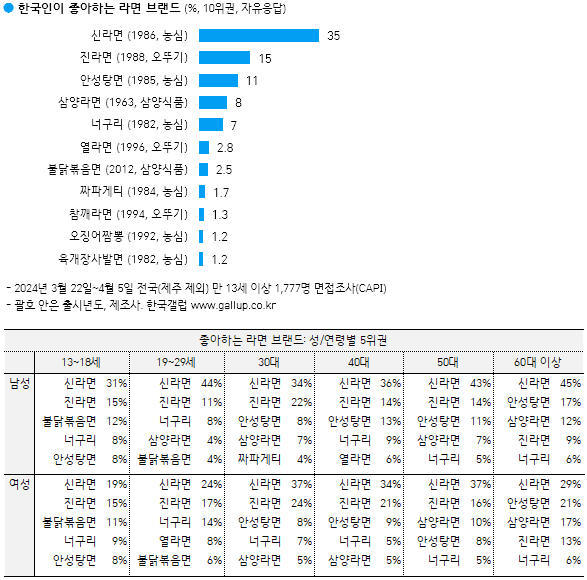 한국갤럽이 2024년 3월 22일부터 4월 5일까지 전국(제주 제외) 만 13세 이상 1,777명에게 가장 좋아하는 라면 브랜드를 물은 결과(자유응답) '신라면'(35%), '진라면'(15%), '안성탕면'(11%), '삼양라면'(8%), '너구리'(7%)까지 5종이 전체 응답의 77%를 차지했습니다. 이외 '열라면'(2.8%), '불닭볶음면'(2.5%), '짜파게티'(1.7%), '참깨라면'(1.3%), '오징어짬뽕', '육개장사발면'(이상 1.2%)이 10위 안에 들었습니다.