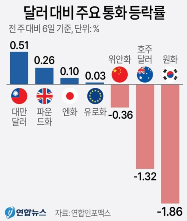 이번주 원화 가치는 주요국 통화와 비교해도 가장 약세였습니다. 연합인포맥스에 따르면 원화는 지난주 달러 대비 1.86% 평가 절하됐습니다.