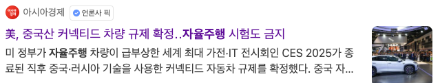 미 상무부는 자율주행 차량이 급부상한 세계 최대 가전·IT 전시회인 CES 2025가 종료된 직후 인, 14일(현지시간) 자동차의 자율주행이나 통신 기능에 중국이나 러시아산 소프트웨어나 부품을 사용하는 커넥티드 자동차의 판매를 단계적으로 금지하는 규제 최종안을 공개했습니다.
