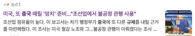 미국은 한때 조선업을 주름잡았지만, 현재 점유율은 1% 미만입니다. 이 보고서는 차기 행정부가 중국에 또 다른 규제를 내릴 근거를 마련해줬으며 중국산 선박에 대한 관세나 항만료를 부과할 수 있는 길을 열 수 있게 됐다고 로이터는 밝혔습니다.