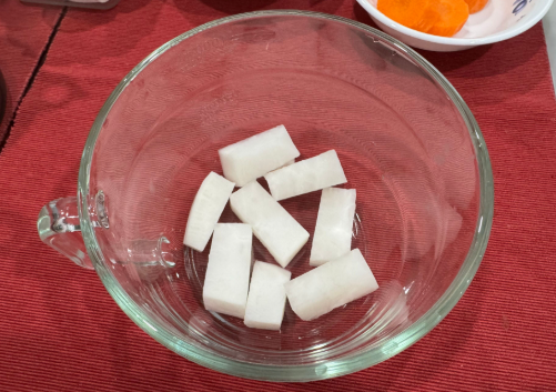 4. 전자렌지 유리용기에 무와 당근을 차례로 바닥에 챙겨 넣습니다.