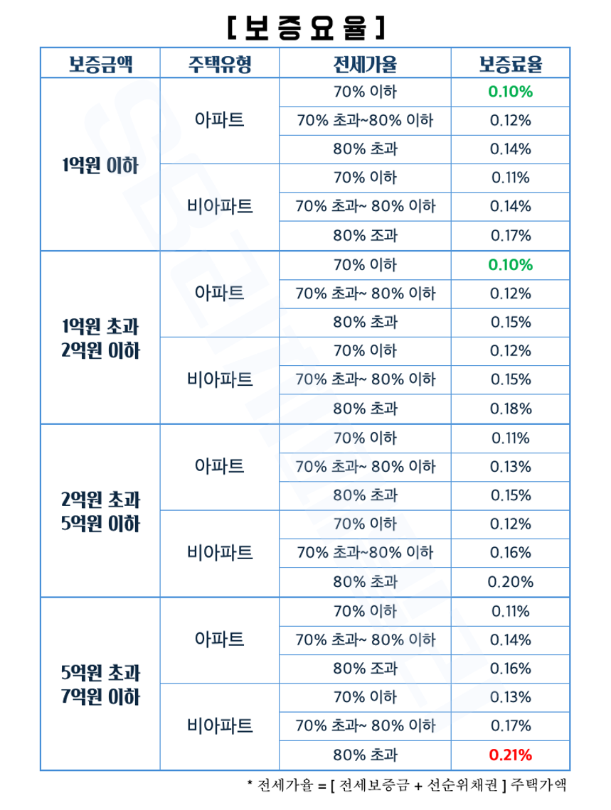 보증금 구간도 4단계로 나눠 차등을 강화했습니다. 세분화 구간은 ▲1억원 이하 ▲1억~2억원 ▲2억~5억원 ▲5억~7억원입니다. 이에 따라 현재 연 0.115~0.154%인 보증료율이 보증금 규모와 전세가율에 따라 0.097~0.211%로 조정됩니다.