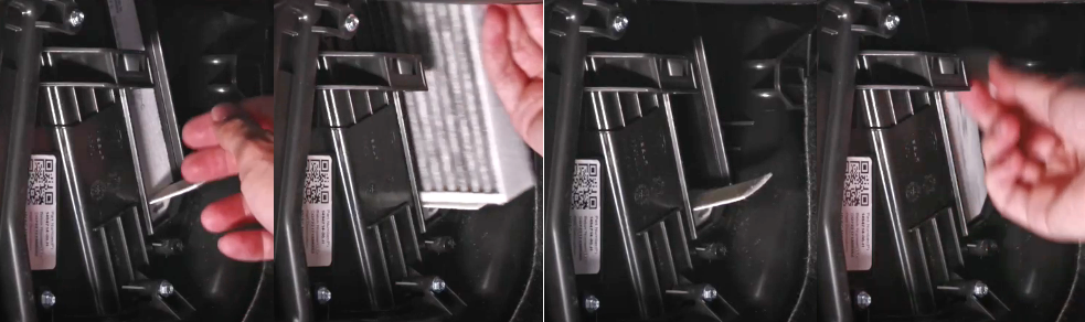 9. 새로운 필터 양쪽 면의 화살표를 차량의 후면을 향하게 하고 하단 실내 필터를 HVAC 모듈에 삽입하고 아래쪽에 설치합니다. 다음으로 상단 실내 필터를 그 위에 삽입합니다.
