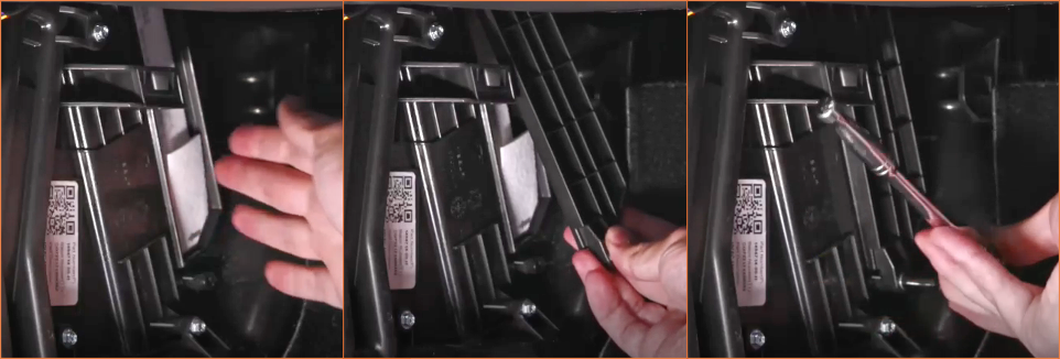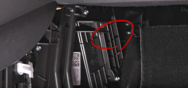 5. 실내 필터 커버를 난방, 통풍 및 에어컨(HVAC) 모듈에 고정하는 6mm 나사를 탈거한 다음 실내 필터 커버를 분리하여 한쪽으로 치워둡니다. 일부 차량에서는 탭이 6mm 나사를 대체합니다. 집게손가락과 엄지손가락을 사용하여 실내 필터 커버 하단에 있는 탭 두 개를 누릅니다. 커버를 바깥쪽으로 기울여 탈거합니다.