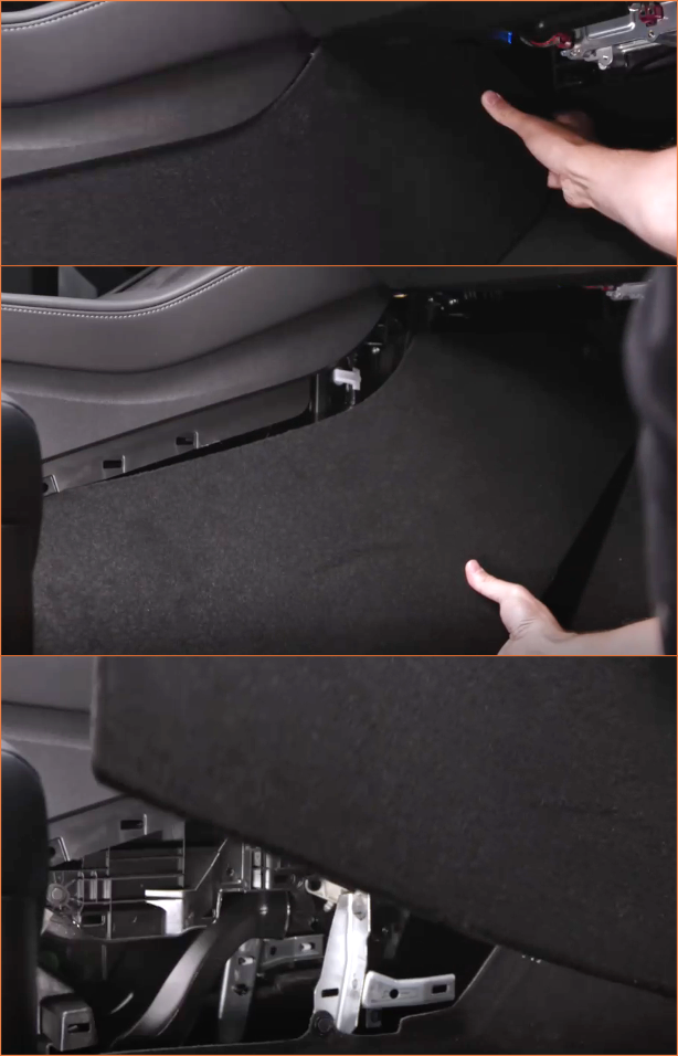 2. 앞좌석 오른쪽 시트를 완전히 뒤쪽으로 이동하고 바닥 매트를 탈거합니다.
