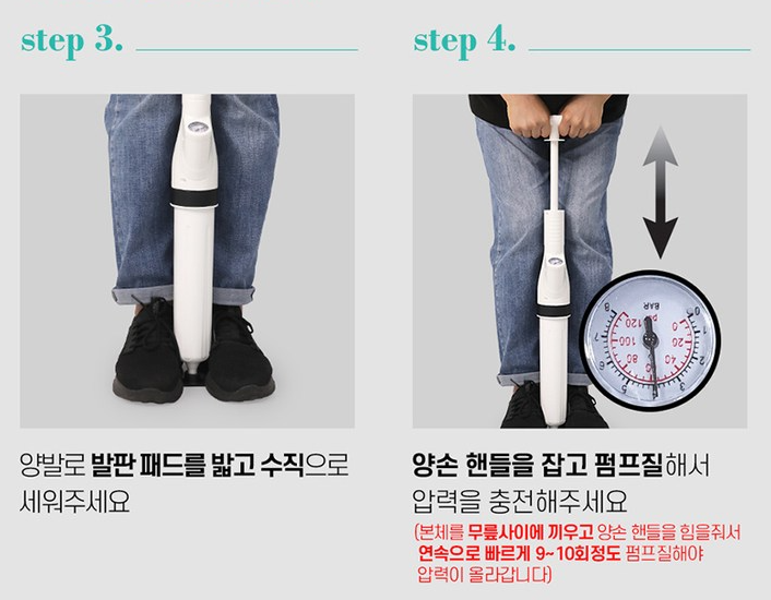 4️⃣ 펌프를 눌러 강력한 압력 생성 (발에 끼고 할 경우)