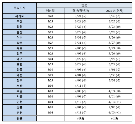 대부분의 지역에서 평년보다 3~7일 정도 일찍 벚꽃이 피기 시작하겠고, 호남 및 수도권 일부 지역에서 평년보다 8일 빠른 시기에 벚꽃이 개화하겠다. 작년과 비교하면 남부지방은 작년보다 0~4일 빠르겠고, 중부지방은 작년보다 0~2일 정도 빠른 시기에 벚꽃이 피기 시작할 것으로 전망해요.