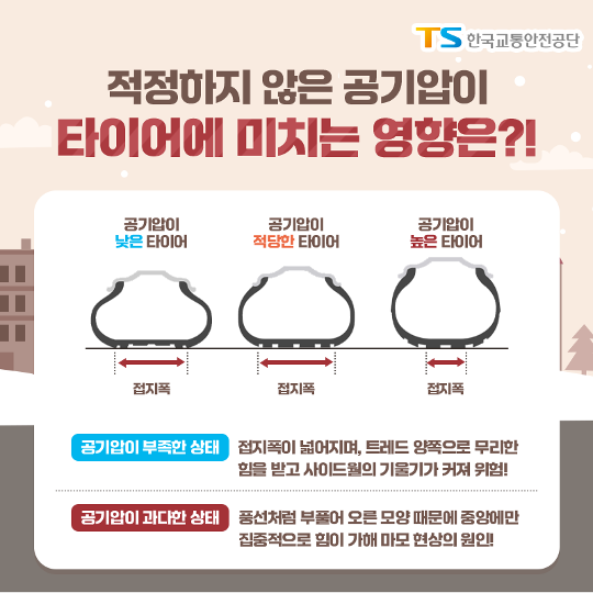 타이어 공기압에 따른 타이어 노면 접지 상태도 살펴보세요.