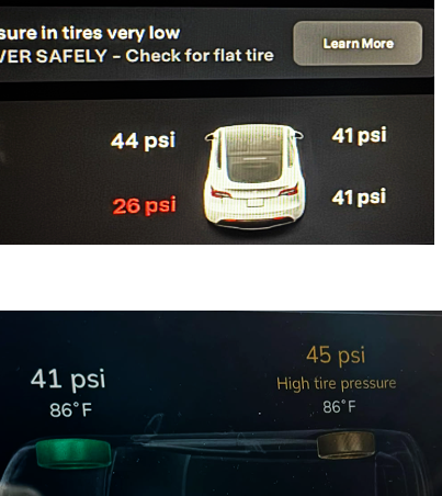 TPMS에 의해 경고되는 타이어 공기압 낮음과 높음 예시.