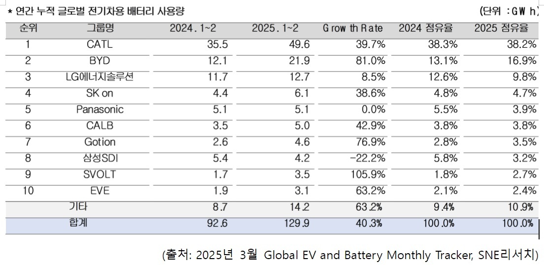 2025년 1~2월 글로벌 전기차 배터리 시장은 40% 이상의 성장세를 보였습니다.