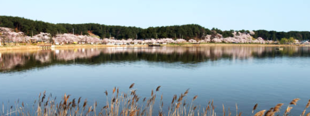 하늘은 푸르고, 바람은 살랑이고, 호숫가를 둘러, 호숫가를 따라 벚꽃은 마침내 봄을 알립니다.