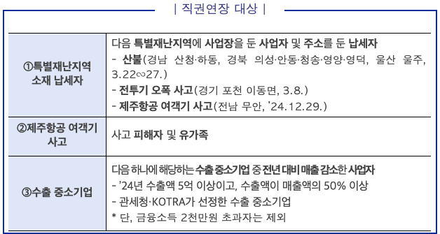 경상도 산불 등 특별재난지역 소재 납세자, 제주항공 사고 피해자 및 유가족 등 14만명의 피해 회복을 지원하기 위해, 종합소득세 납부기한을 별도 신청이나 납세담보 없이 9.1.(월)까지 직권연장합니다.
