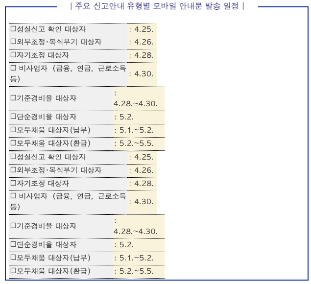 5월은 종합소득세 및 개인지방소득세 신고・납부의 달로, 국세청은 4.25.부터 신고 안내문을 모바일로 발송합니다.