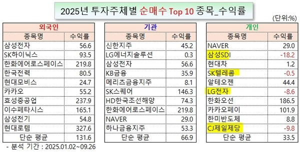 - 외국인: 개인 투자자 수익률의 4배에 달하는 압도적인 성과를 기록했습니다. 외국인 투자자는 반도체 업종의 강세를 예측하고, 삼성전자와 SK하이닉스 등 대형 반도체주를 집중적으로 매수했습니다. 10월 초까지 외국인 순매수 상위 10개 종목의 평균 수익률은 145.6%에 달한 것으로 집계되었습니다.