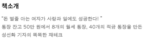 “돈 벌줄 아는 여자가 사랑과 일에도 성공한다! ”통장 잔고 50만 원에서 8개의 월세 통장, 40개의 적금 통장을 만든 성선화 기자의 똑똑한 재테크 겉보기에 그녀는 꽤 잘나가는 경제 신문 기자