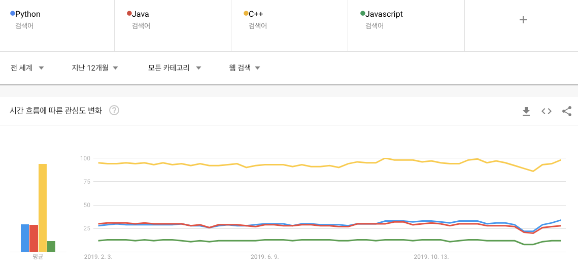 한국(South Korea)에서의 4가지 개발언어의 인기를 살펴보자.