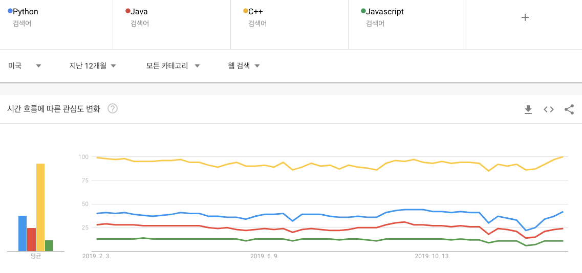 미국(USA)에서의 4가지 개발언어의 인기를 살펴보자.