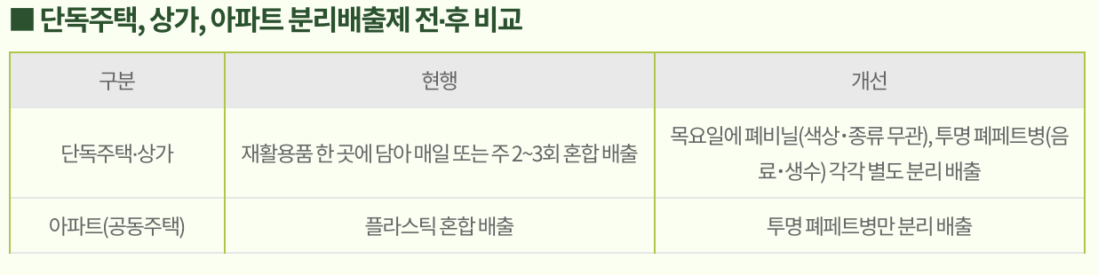 ▴단독주택・상가지역은 폐비닐(색상・종류 무관) 및 폐페트병(음료・생수 투명)을 목요일에 각각 별도 분리 배출하고, ▴아파트(공동주택)의 경우, 음료・생수 투명 폐페트병을 유색 폐페트병 및 타 플라스틱과 분리하여 요일과 상관없이 별도 전용 수거함에 분리 배출하면 된다.