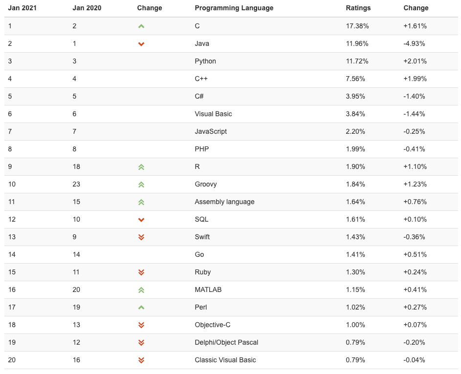2021년 1월 TIOBE 프로그래밍 언어 순위
