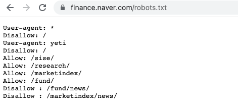 도메인 주소/robots.txt 를 확인하면 크롤링 가능 여부를 파악할 수 있습니다.