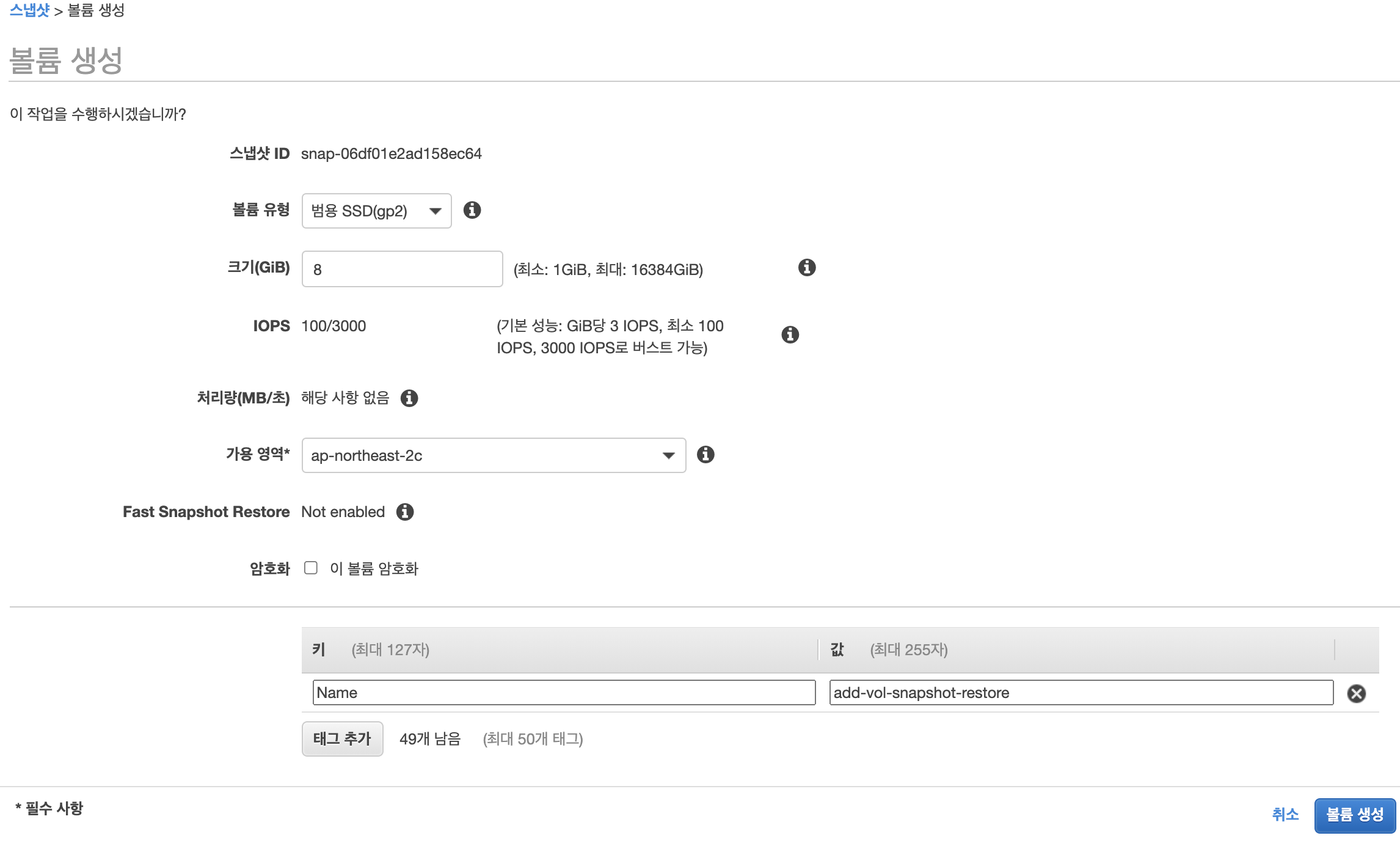 name tag는 'add-vol-snapshot' 로 합니다.