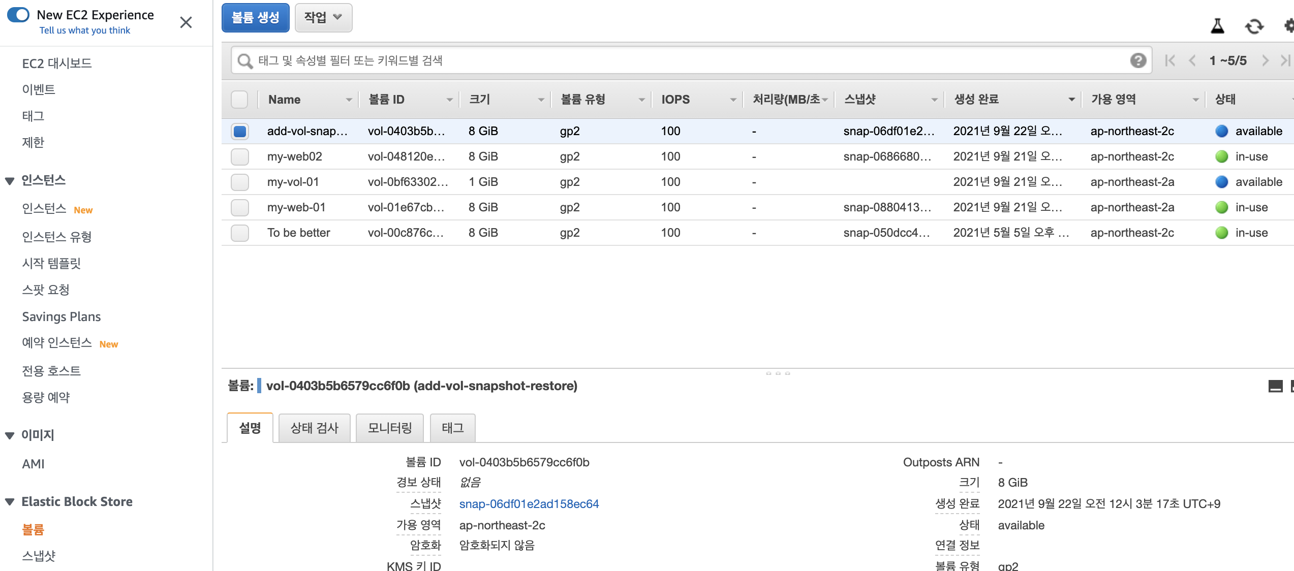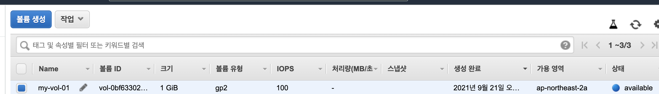 EBS > 볼륨 메뉴로 이동합니다. 볼륨생성에는 동일 가용영역(AZ)이어야 합니다.