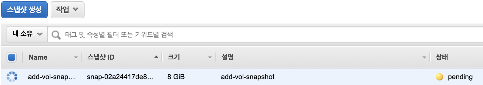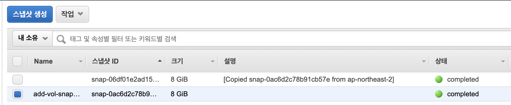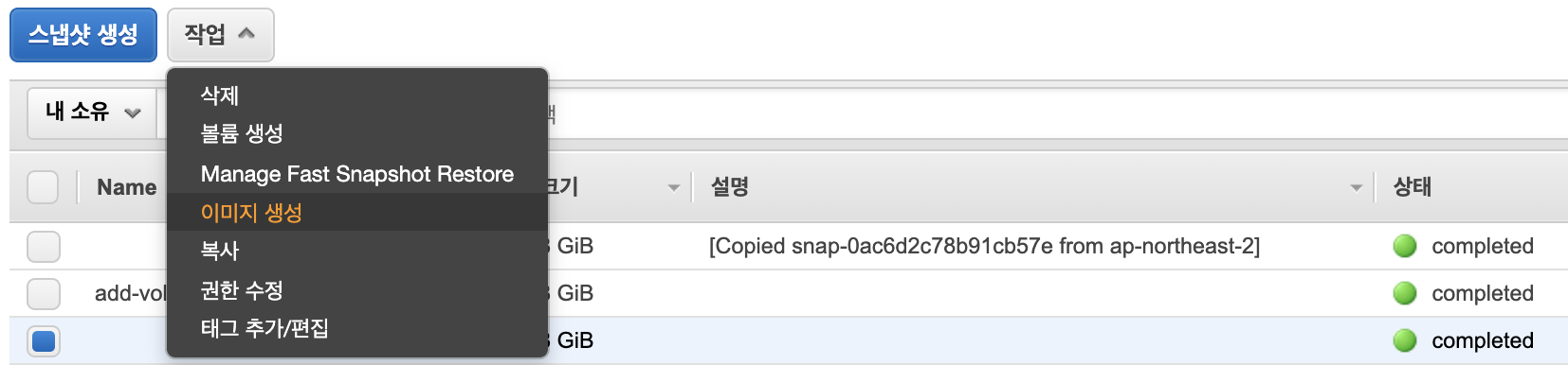 그러면, 먼저 스냅샷 생성을 해볼까요.(스토리지를 다른 리전으로 복사하기를 해볼려고 합니다)