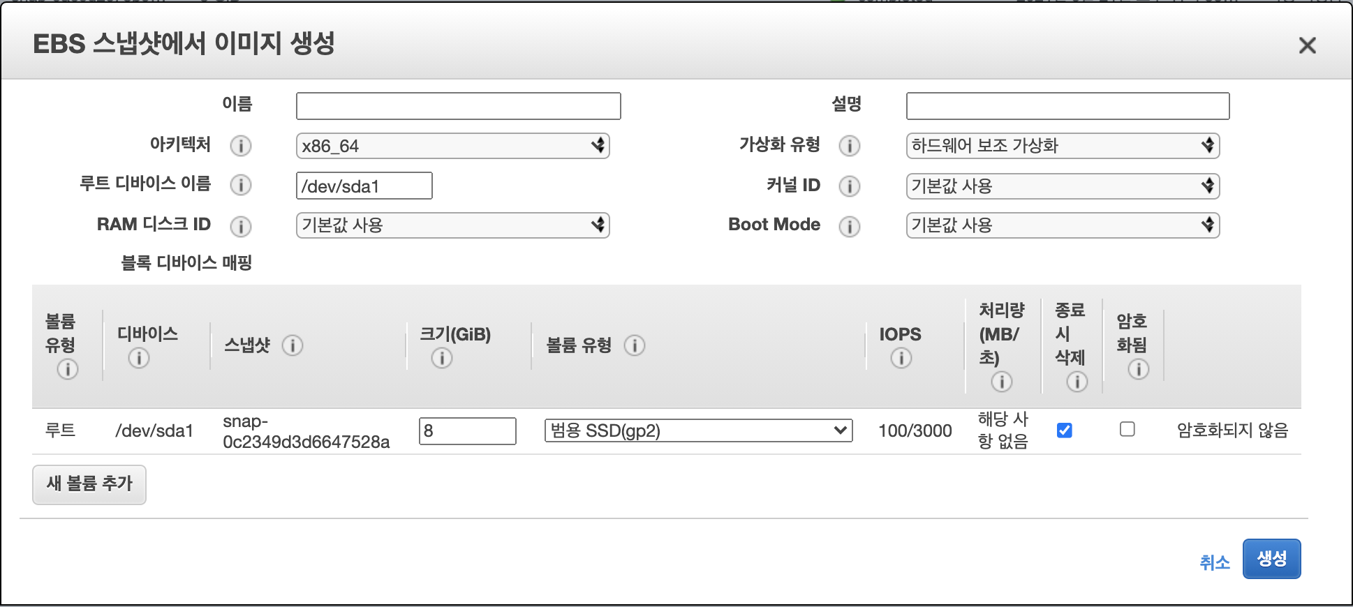 부트볼륨을 '스냅샷' 생성하고 '스냅샷' 이미지를 생성합니다.