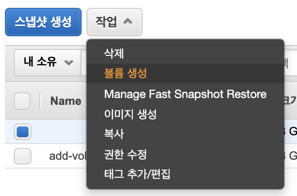 볼륨 메뉴에서 스냅샷 생성을 클릭합니다.