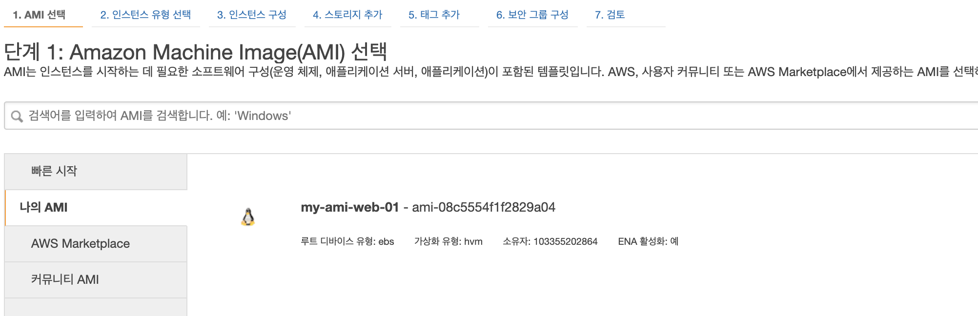 인스턴스 단계1 에서 '나의 AMI'를 선택