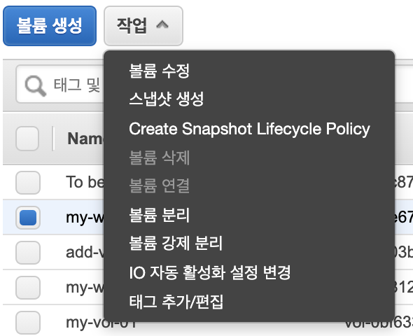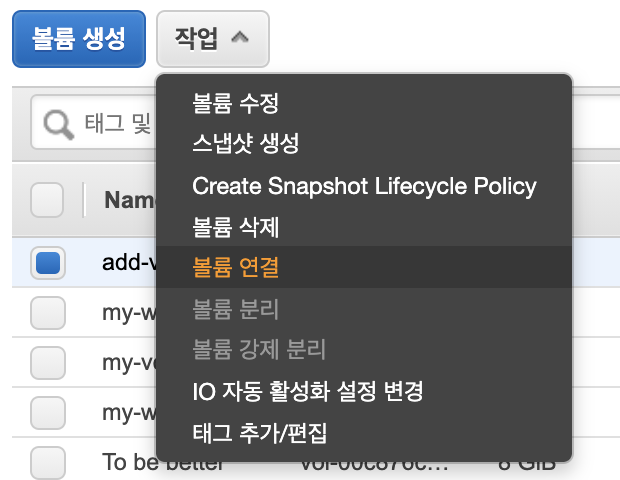 AWS 볼륨 페이지에서 선택한 볼륨