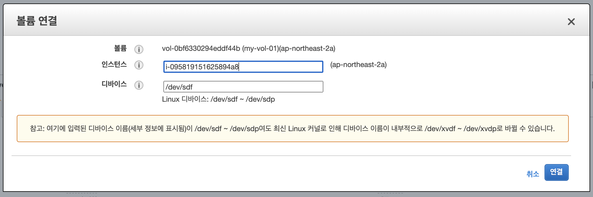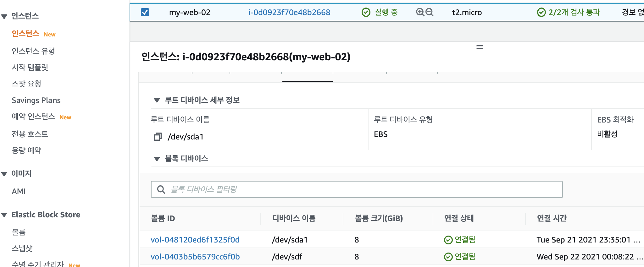 EC2 인스턴스에서도 볼륨이 연결된 것을 확인가능합니다.