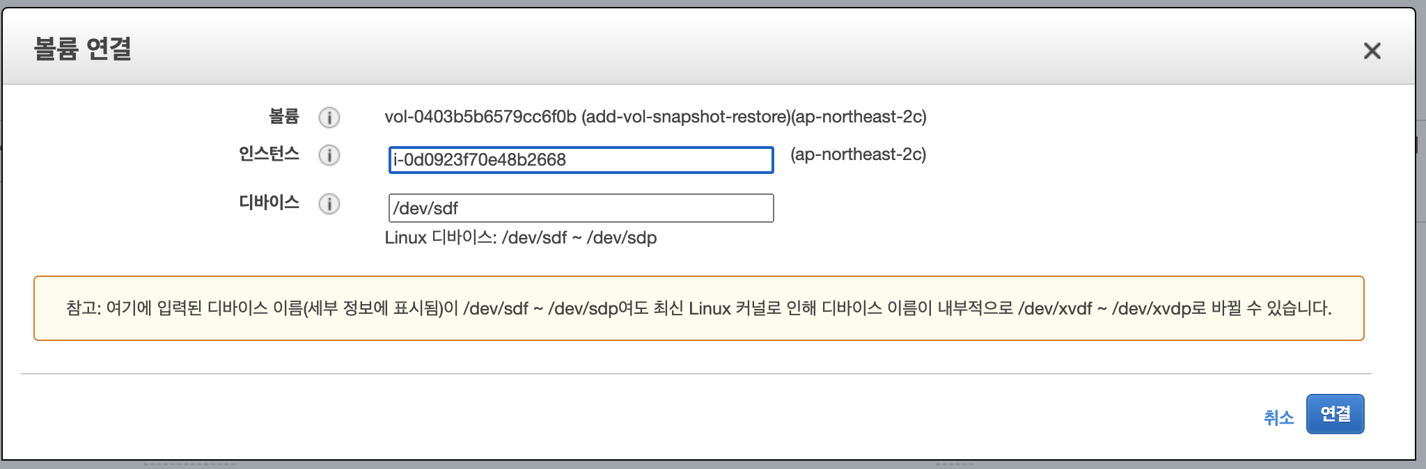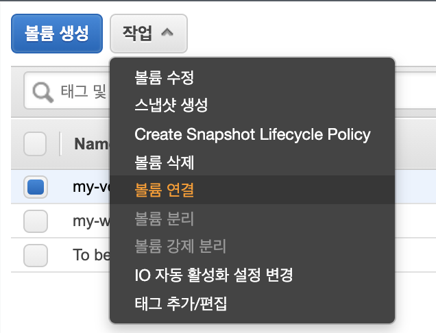 2.1.4. 볼륨을 EC2에 연결을 선택합니다.