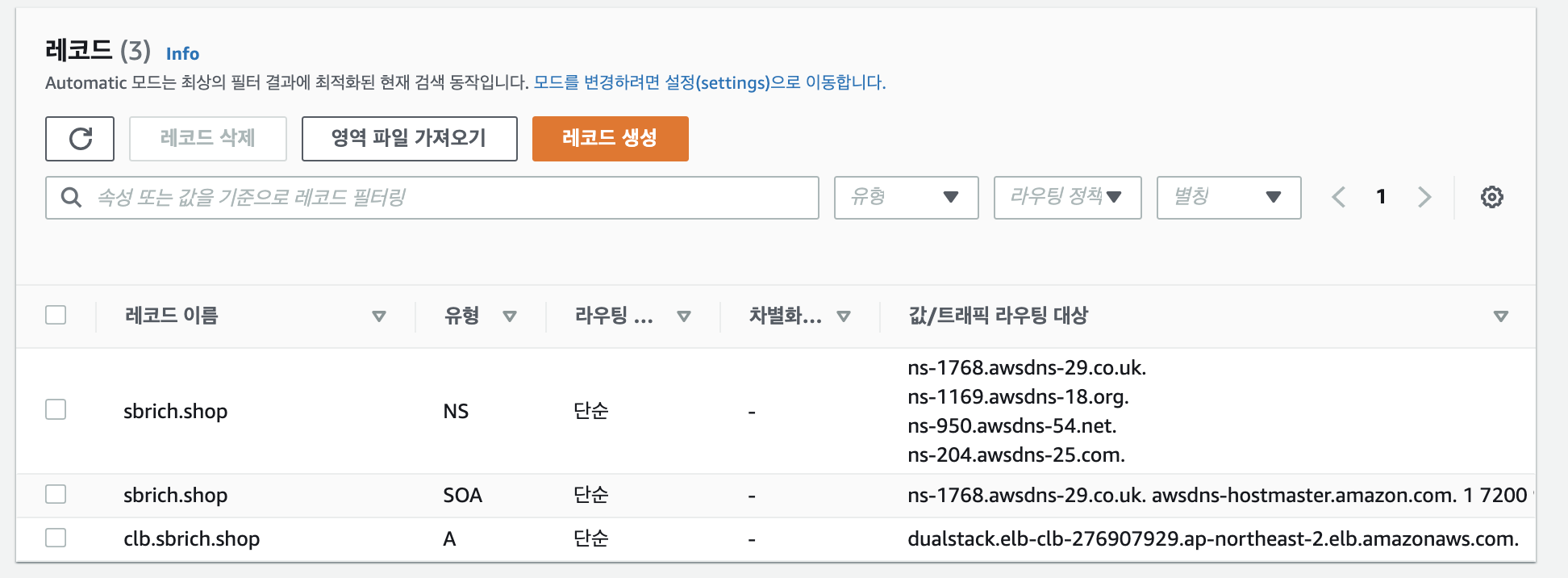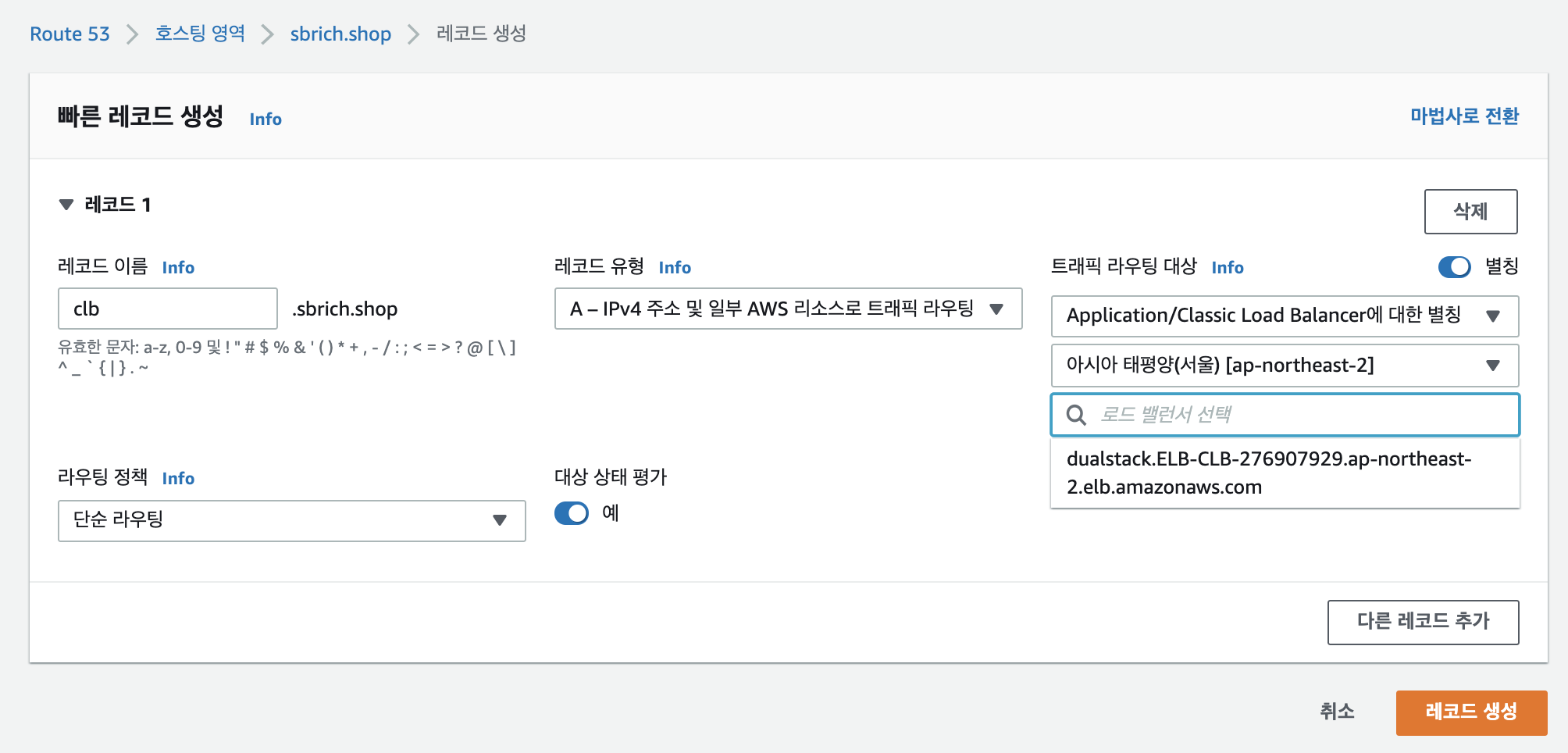 - 별칭 (체크) : "트래픽 라우팅 대상" > "application/classic load balancer에 대한 별칭" > 리전: "아시아 태평양(서울)" > 생성한 CLB를 선택 레코드 생성 클릭 주소 "http://elb-clb-1626253128.ap-northeast-2.elb.amazonaws.com/"