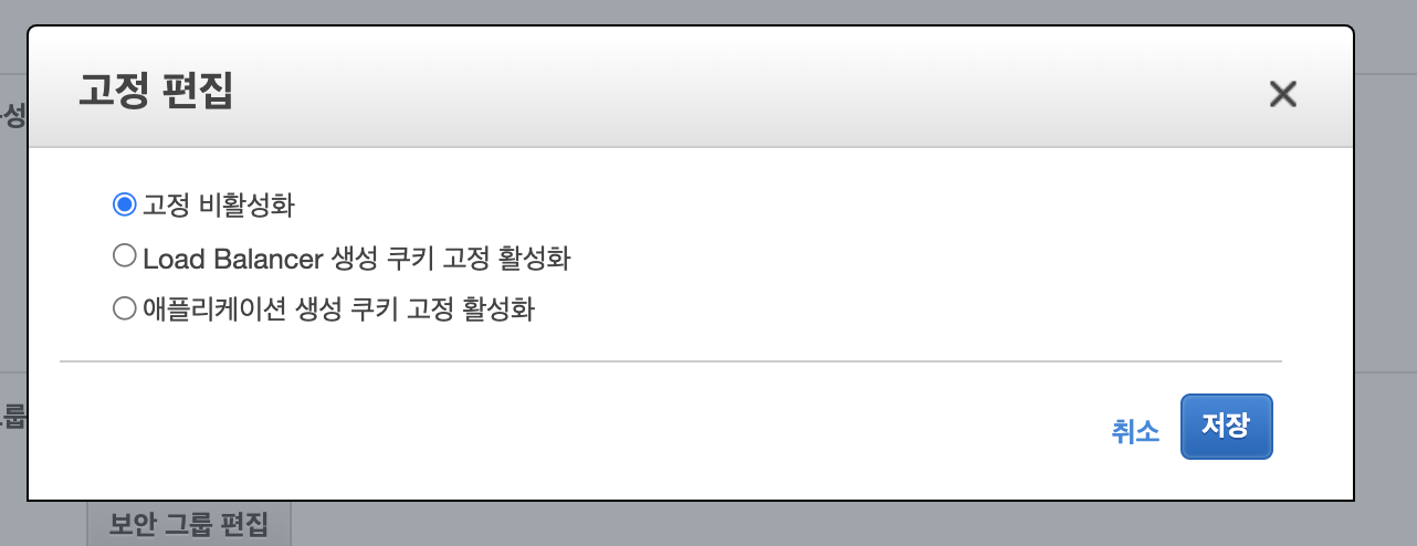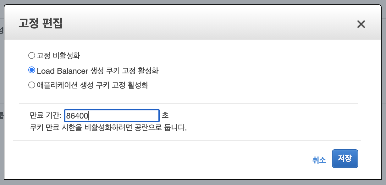 고정편집 : "Load Balancer 생성 쿠키 고정 활성화" 선택후 시간 입력