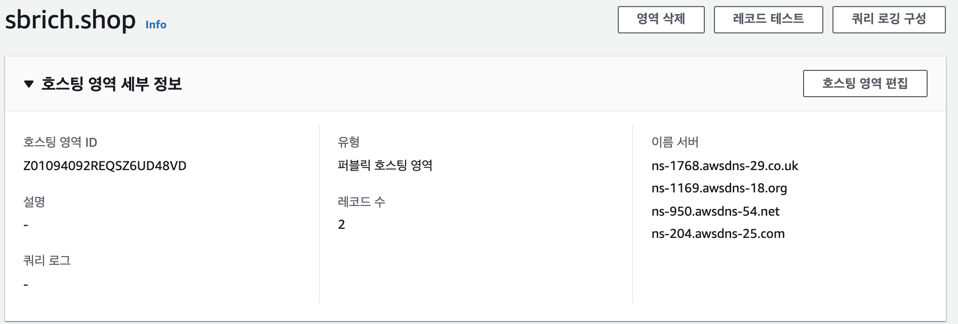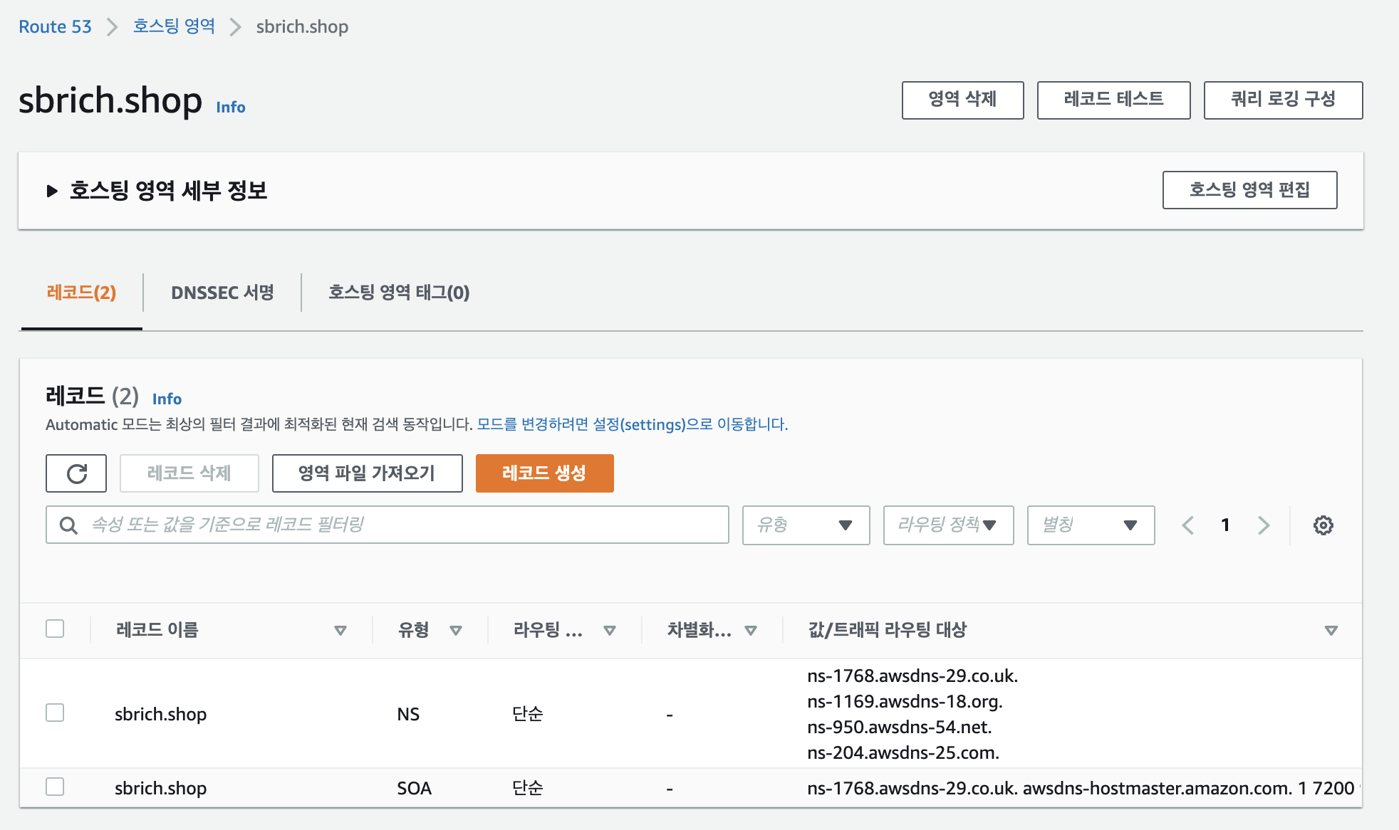 호스팅영역 생성 후, 호스팅 영역 세부정보입니다.