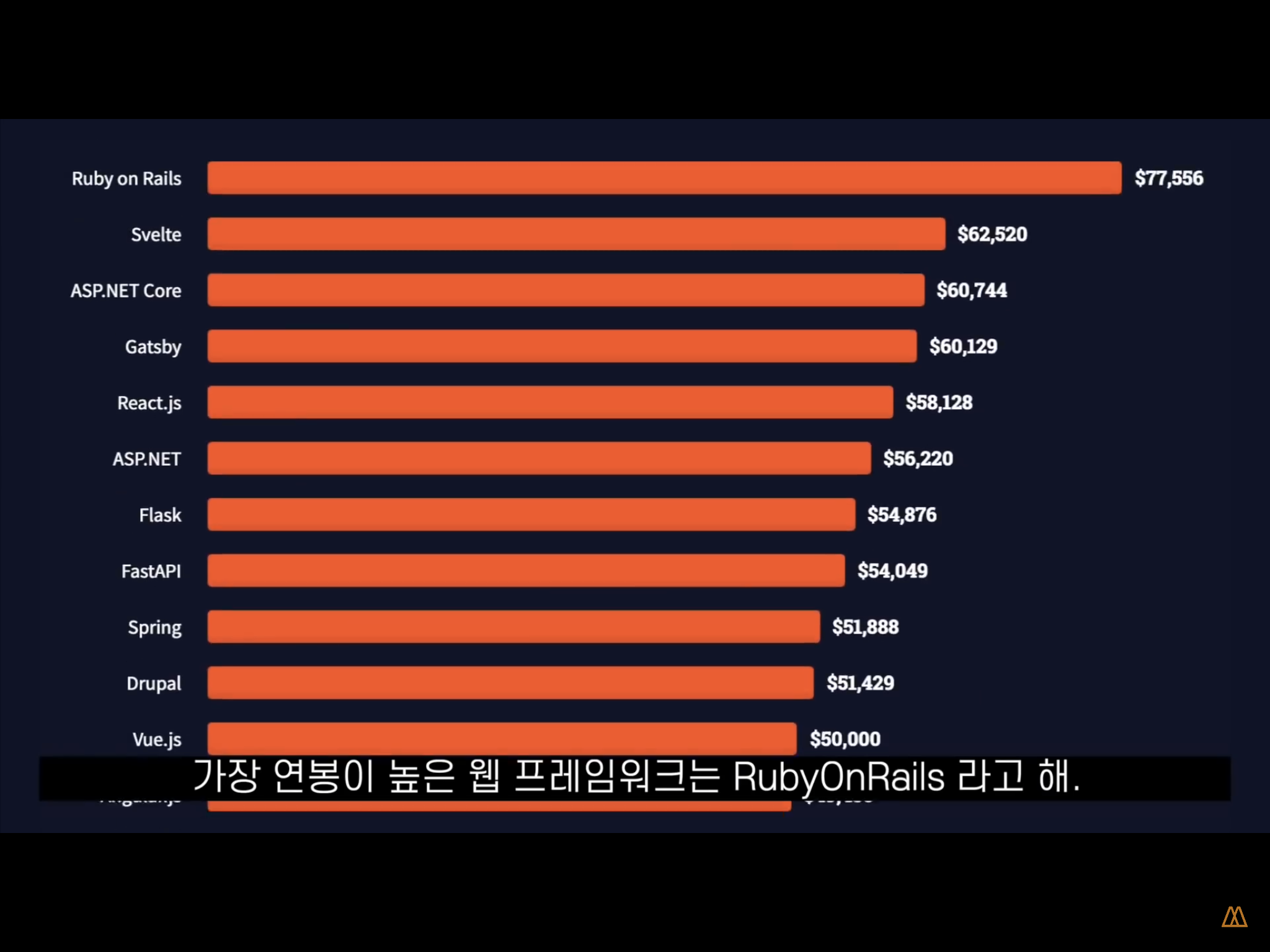 가장 연봉이 높은 연봉은 Ruby on Rails입니다.
