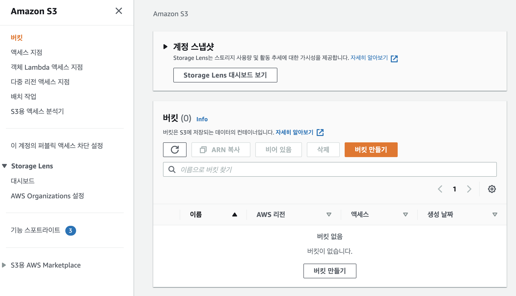 S3 > 버킷 메뉴로 이동합니다. 그리고 버킷만들기를 클릭합니다.