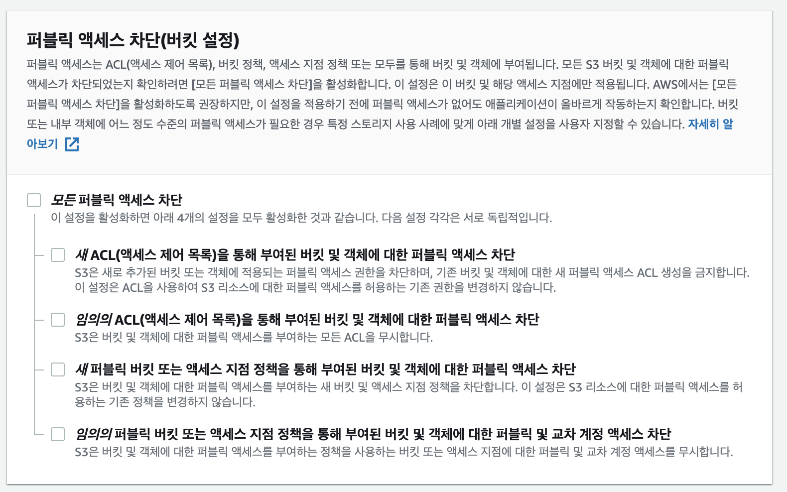버킷의 퍼블릭 액세스 차단 설정에서 '모든 퍼블릭 액세스 차단'을 해제합니다.