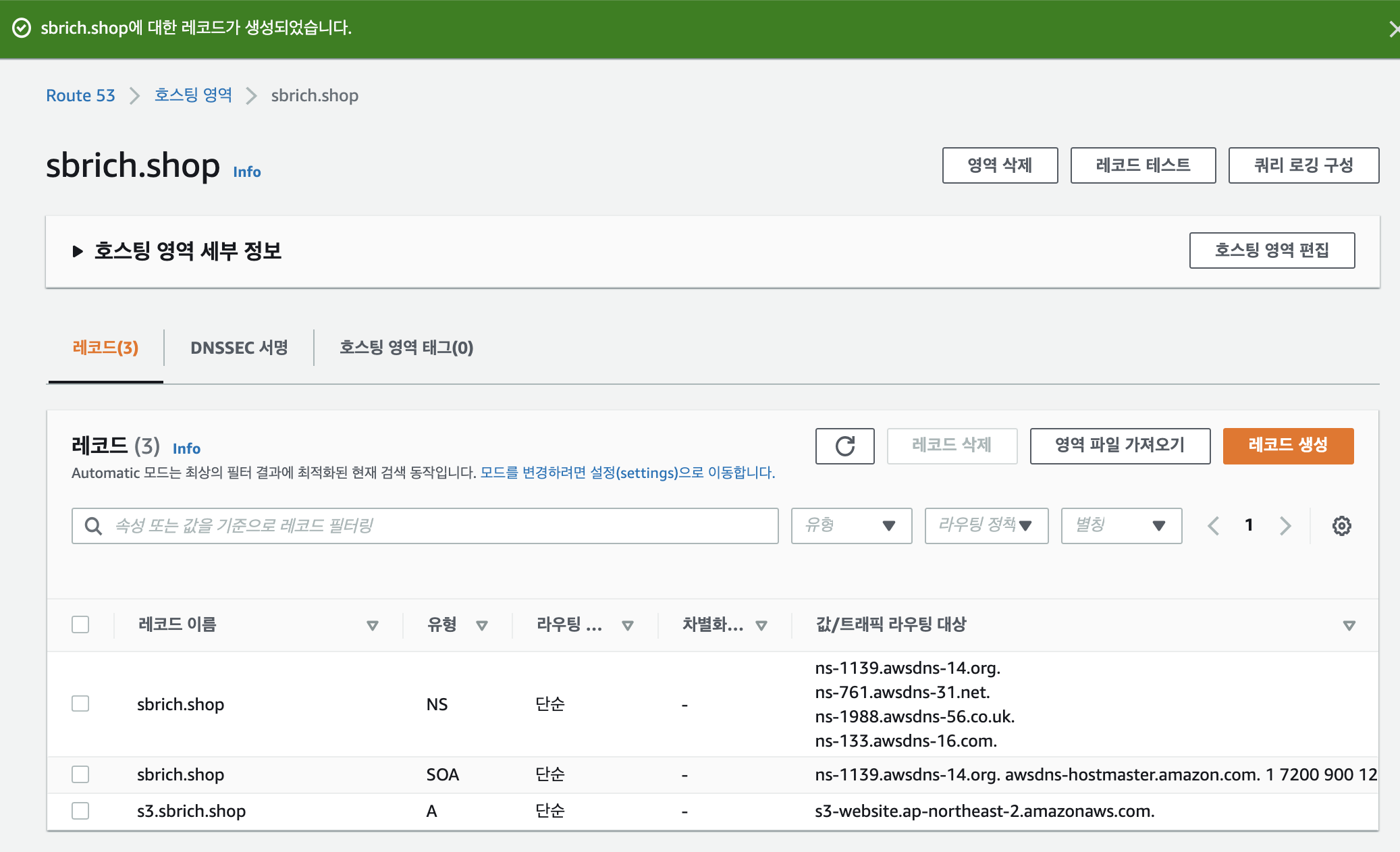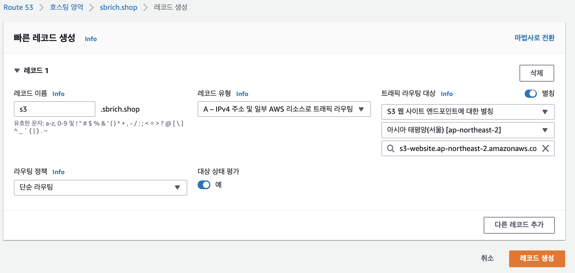 생성된 앤드포인트 "http://s3.sbrich.shop.s3-website.ap-northeast-2.amazonaws.com"를 Route53설정에서 사용합니다.