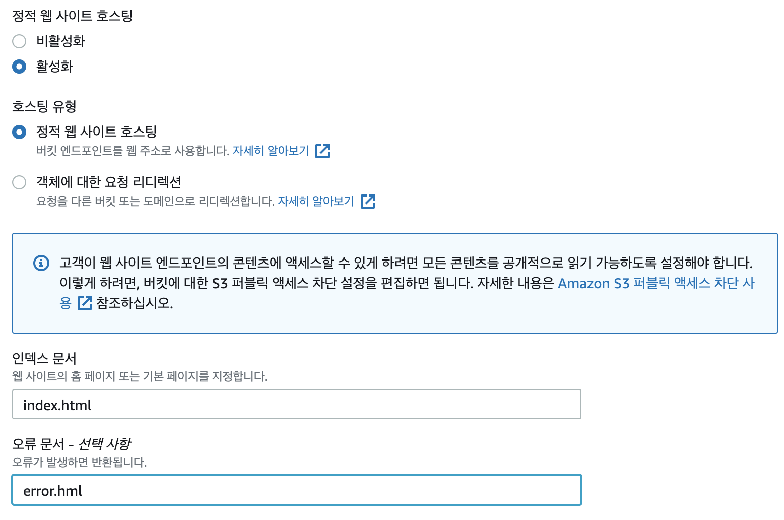 활성화를 선택하고 호스팅 유형을 설정합니다. 인덱스 문서, 오류 문서를 입력합니다.
