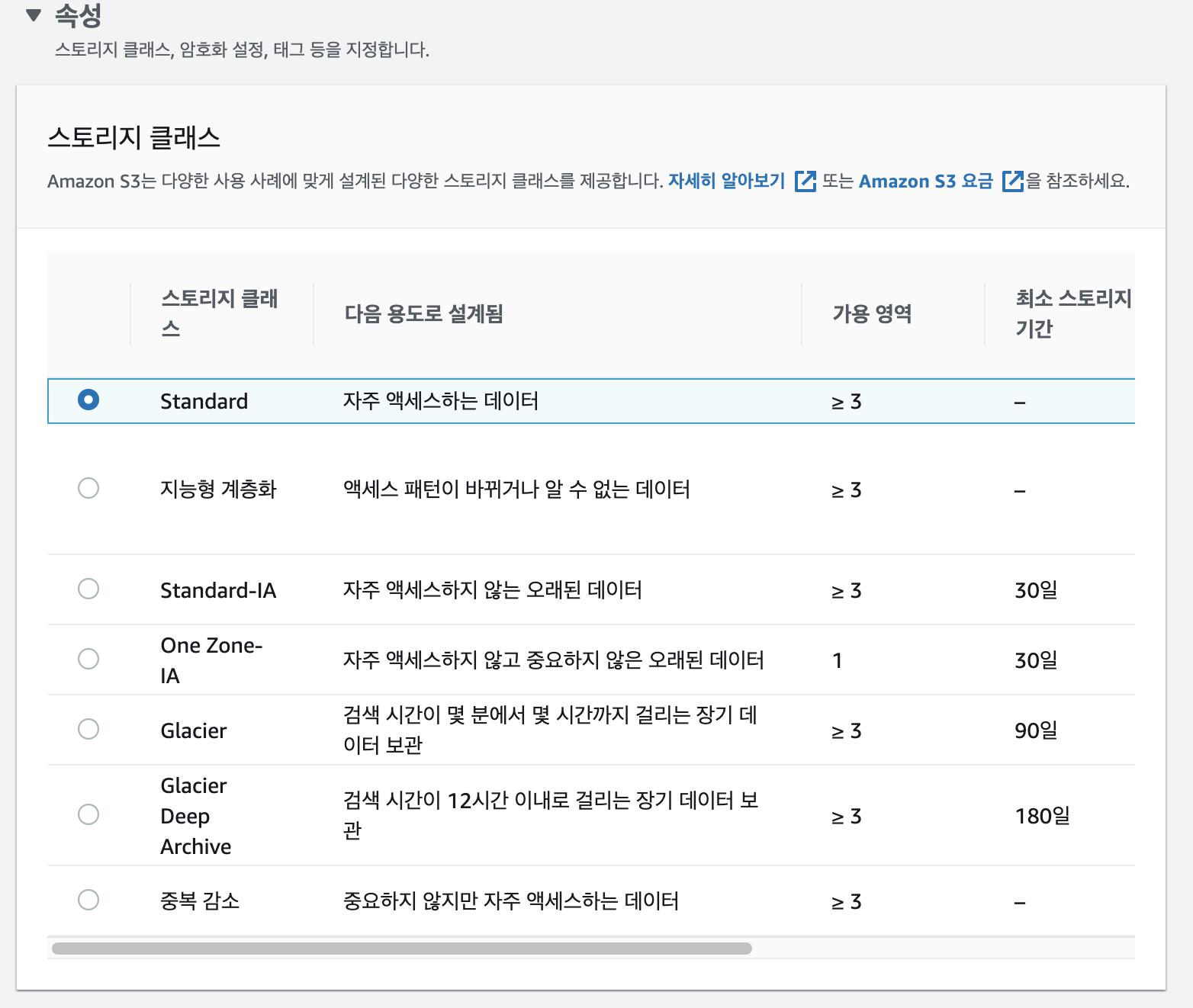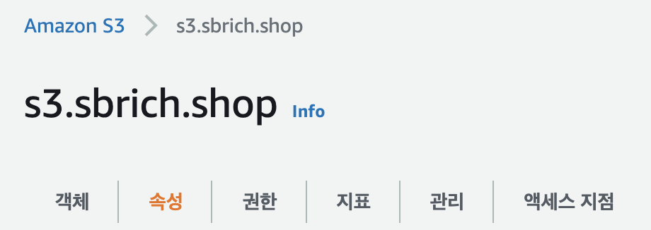 생성된 버킷의 상세에서 속성탭을 클릭합니다.