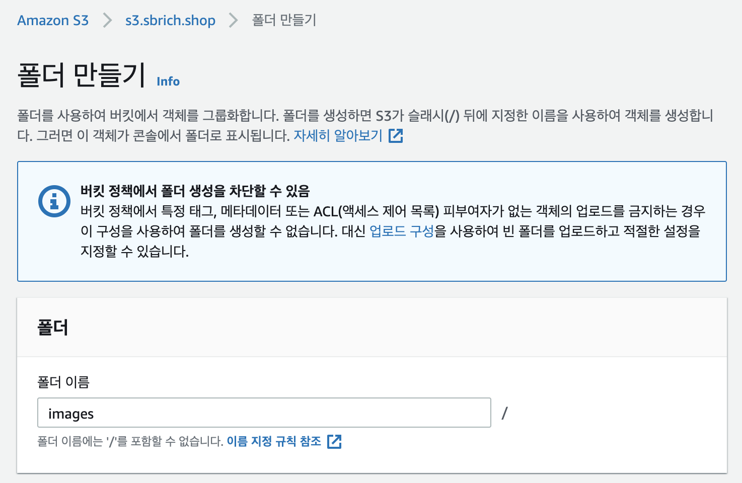 생성된 버킷에 이미지를 업로드하기 위하여 폴더를 만들겠습니다. 폴더명은 'images'라고 입력합니다. 폴더만들기 버튼을 클릭합니다.